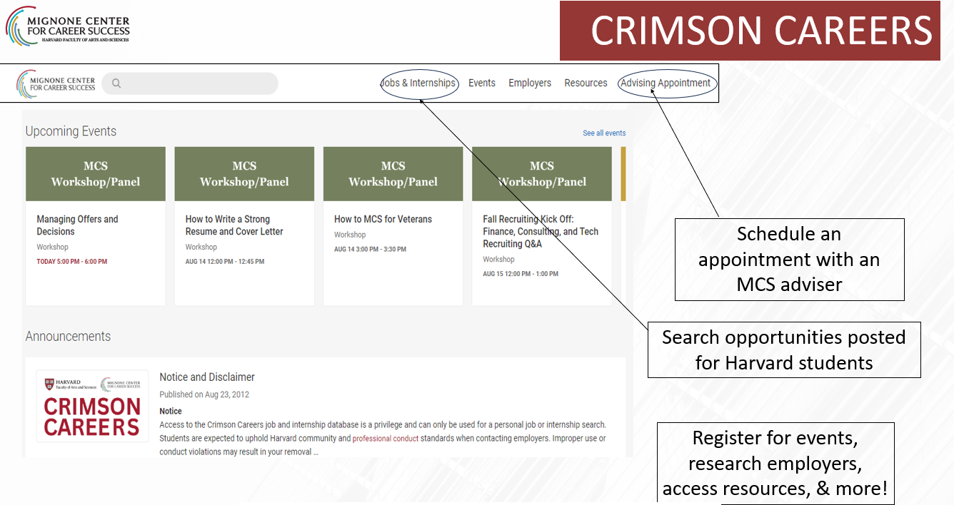 Visit Crimson Careers to search for a job or internship, register for an event, or schedule an advising appointment: